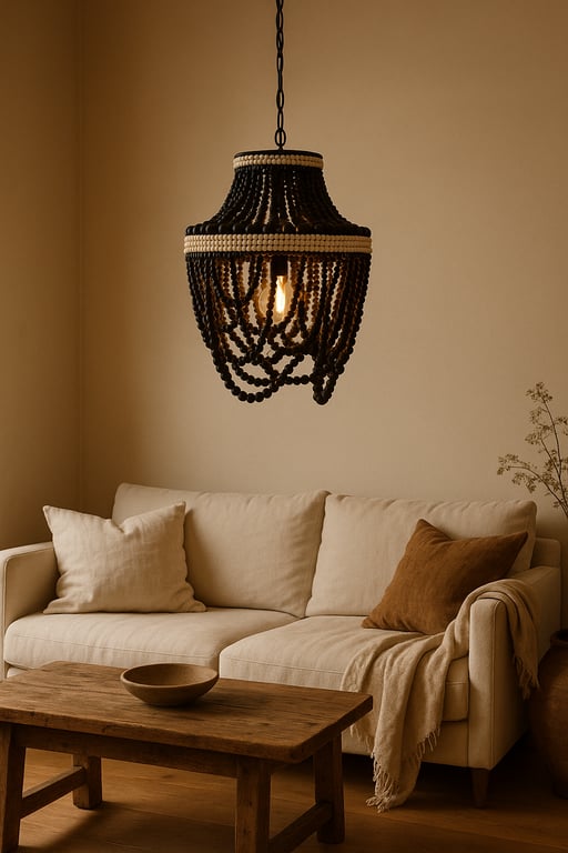 Amber ist die Verkörperung von zeitloser Eleganz mit einem Hauch von Ethno-Chic. Ihre aus Holzperlen gefertigte Struktur in tiefem Schwarz strahlt ein luxuriöses Flair aus, das sowohl stilvoll als auch dezent ist. Amber fühlt sich überall wohl – ob als Highlight in modernen Räumen oder als subtiler Akzent in einem Ethno-inspirierten Ambiente. Ihre Fähigkeit, die Umgebung zu erhellen, macht sie zu einem Blickfang, der nie aufdringlich wirkt, sondern jeden Raum mit subtiler Raffinesse füllt.