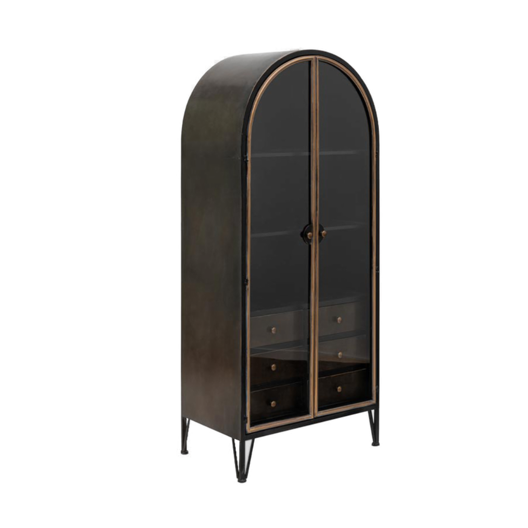 Juri, der Schrank im Industrial Stil, kombiniert Eisen mit Glaselementen und Fächern für eine moderne und funktionale Optik. Der Schrank bringt mit seinen klaren Linien und robusten Materialien industriellen Charme in dein Zuhause.